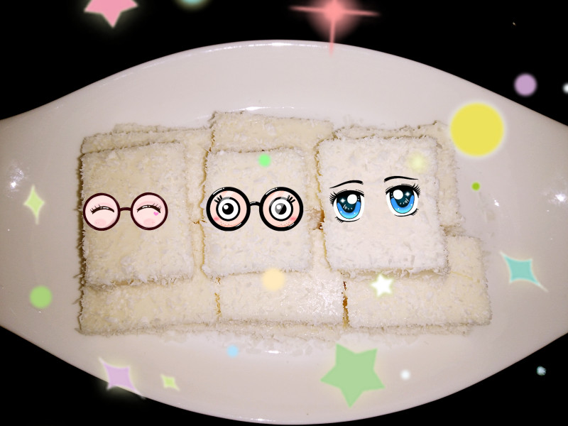 8:倒入事先准备好的方形烤盘中,并在表面铺一层椰蓉。凉透后套一个大的食品袋,封好口,放冰箱冷藏一夜至混合物凝固成奶块。