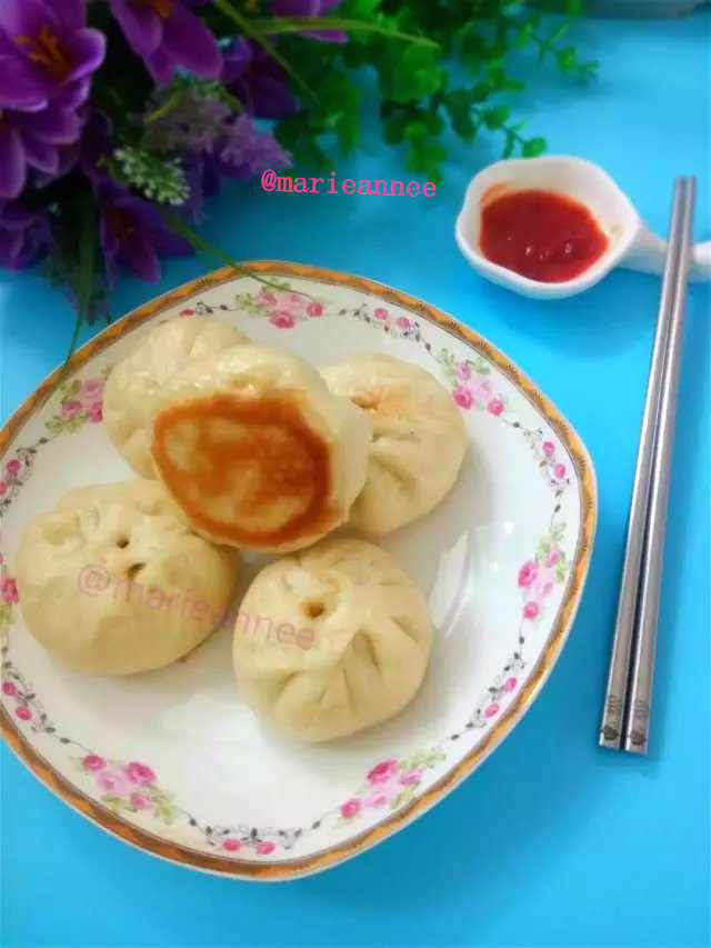 13:平底不粘锅热锅,刷上1大匙油,放入包子煎约1分钟。