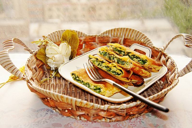 5:取一张煎饼铺开,在三分之二处对折,放上韭菜鸡蛋馅,大点馅才好吃。