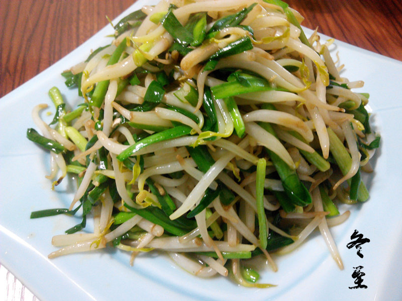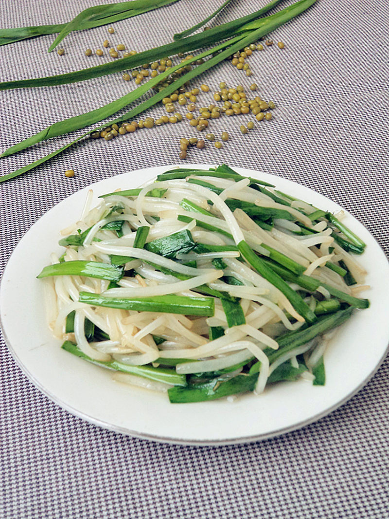 4:锅烧热放适量油,倒入绿豆芽和韭菜,加适量盐调味,翻炒几下即可。