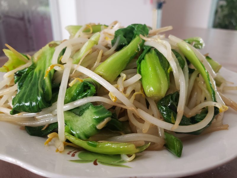 4:下入绿豆芽煸炒2-3分钟,下入盐,淋几滴醋,味素