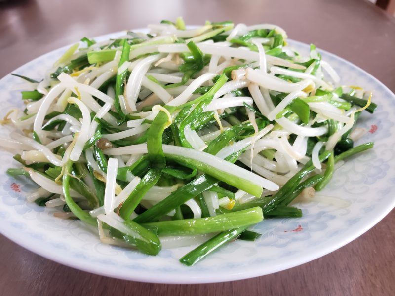 5:锅烧热,加油,韭菜根入锅煸香,豆芽菜入锅炒。