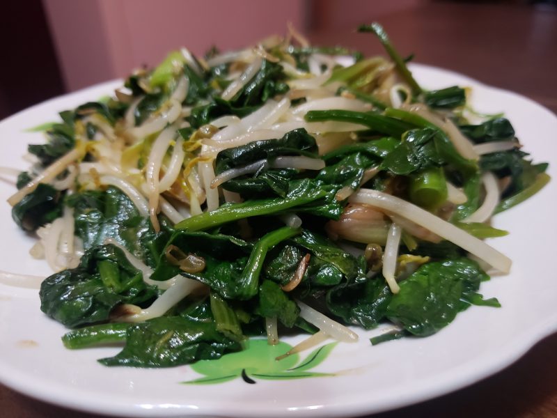 4:锅烧热放适量油,倒入蒜苗炒香,再倒入菠菜和绿豆芽加少许盐调味,翻炒几下即可。