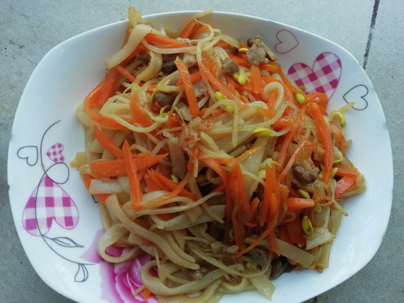 6:加入胡萝卜丝、豆芽略炒;