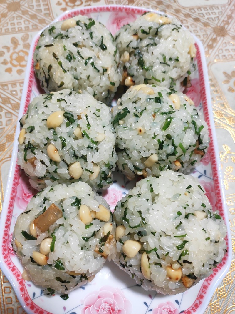 6:接着倒入煮好的糯米、花生、韭菜,翻炒均匀即可关火(注意过程中要使用小火)。