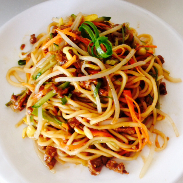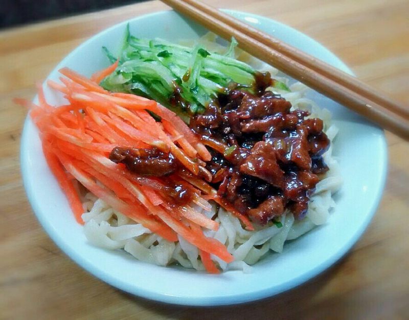 8:搭配自己喜欢的青菜,炸酱面搭配黄瓜丝、绿豆芽都十分可口。