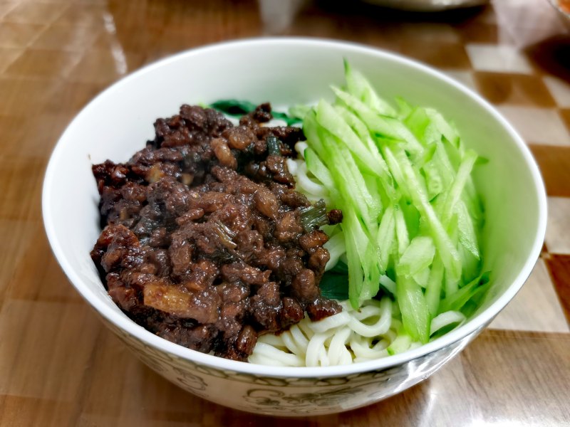 5:再淋上炸酱,拌匀就可以吃了~酱汁浓郁包裹着面条,混合着肉香,这味道绝了。
