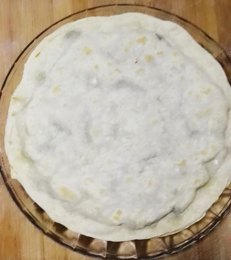 7:擀成圆片,加入适量的韭菜鸡蛋馅。