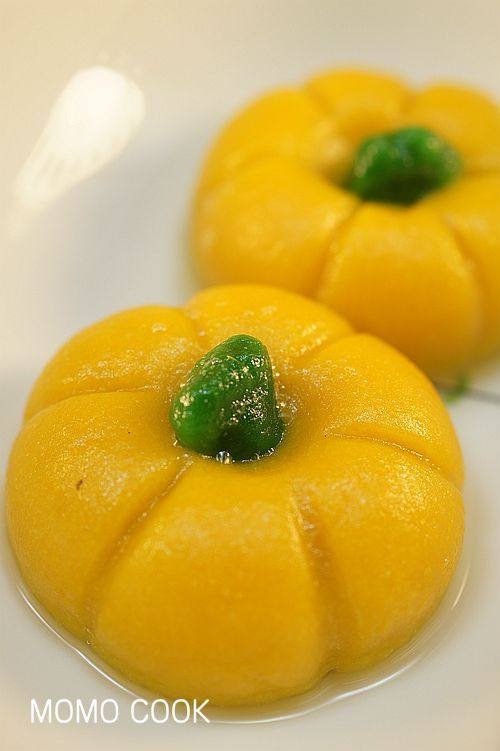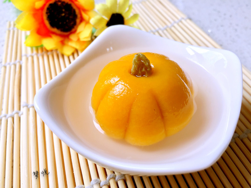12:开水下锅,轻轻放入,注意将带有南瓜蒂的一端朝上,沸水煮至漂浮即可。