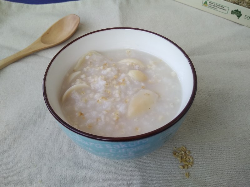 10:最后倒入燕麦片,稍微搅拌均匀,盖上锅盖焖一会。入盐和香油调味即可。