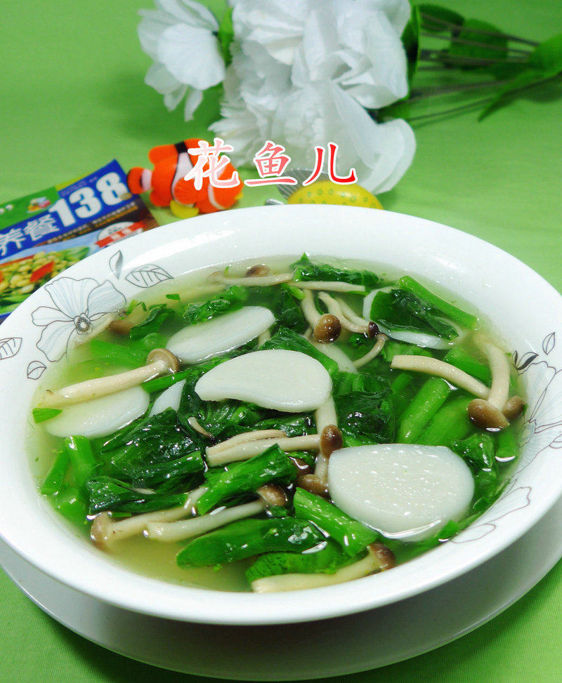 1:食材:年糕、蟹味菇(已清洗)、菜芯(已清洗)