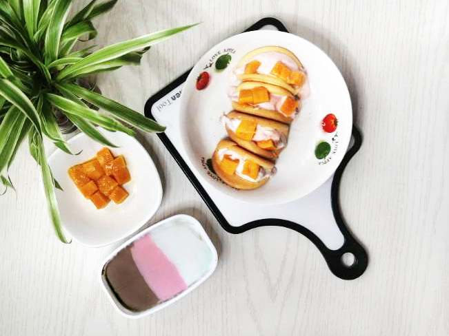 14:填入冰淇淋,点缀芒果丁。