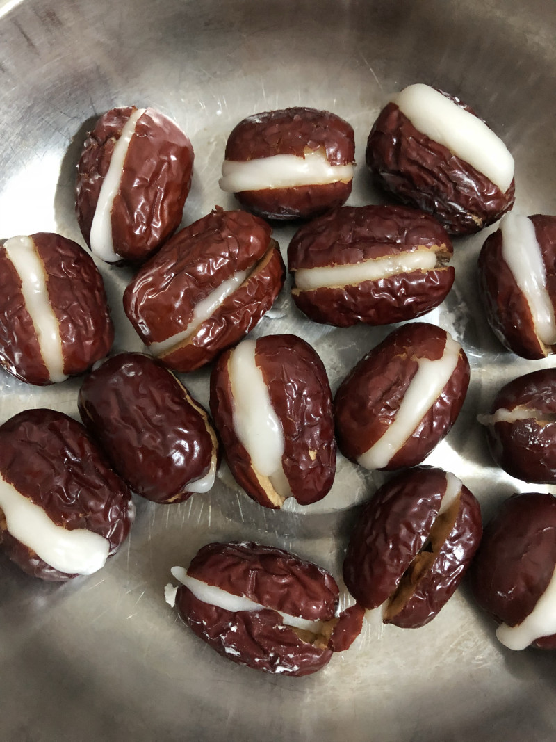 3:糯米粉团揉成小条,建议揉胖一点,塞进红枣里。