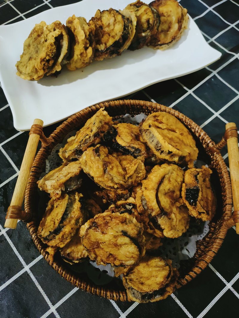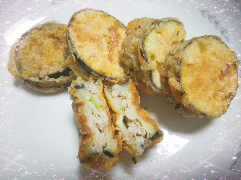 9:面粉,水,鸡蛋,调成稠稠的面糊,茄盒粘满面糊。不粘锅里放油,油热了放入茄盒,炸至两面金黄。