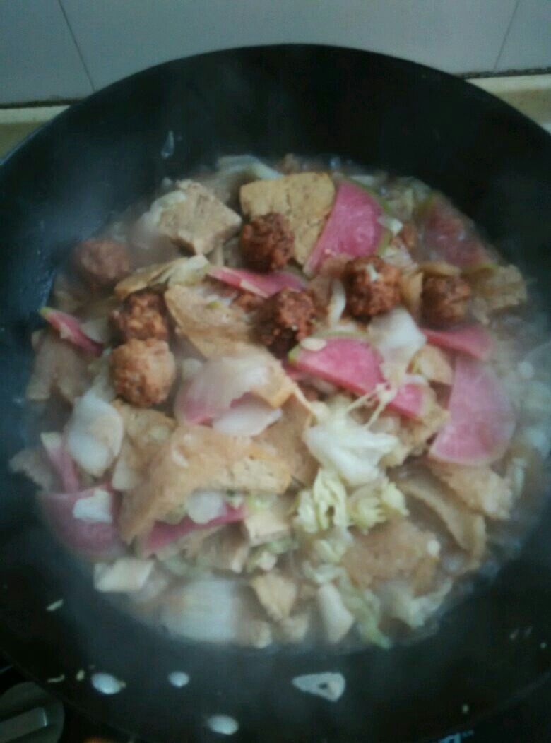 13:加入适量的水,在放入粉条、手工丸子、炸豆腐、冻豆腐和橡皮。