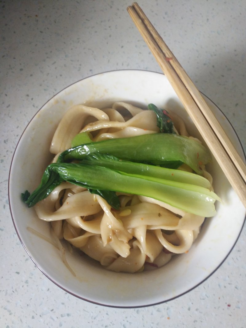 11:将扯面捞入碗中,放入蔬菜,食盐和辣椒面。
