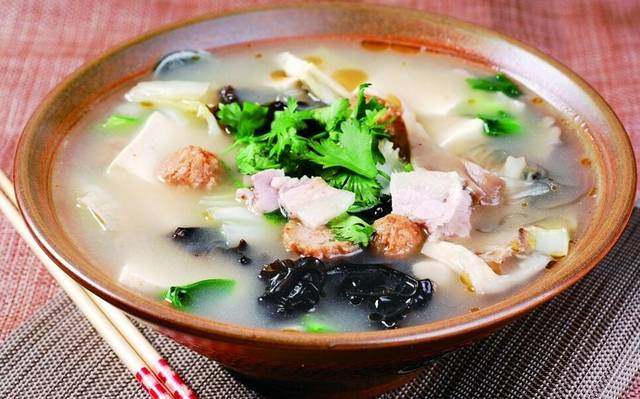 白菜100g;粉条100g;瘦肉丸子100g;油炸豆腐100g;大骨汤500g;红萝卜20g;小酥肉10g;腐竹30g;黄花菜30g;小青菜10g;
