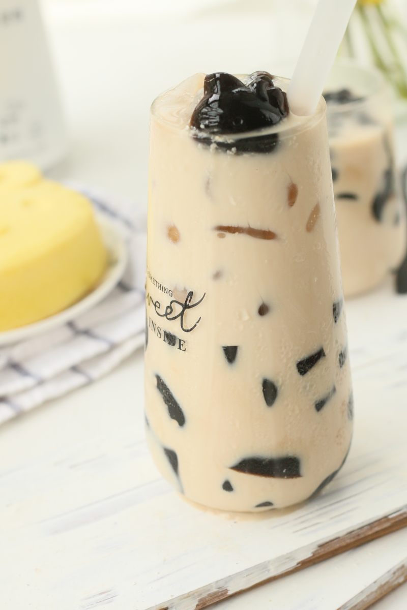 7:约25分钟后奶茶制成,杯里倒入适量的仙草冻和冰块。