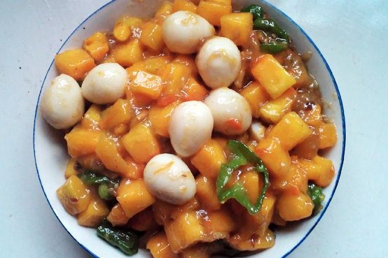 2:南瓜切成小方丁,鹌鹑蛋煮熟后去壳备用。