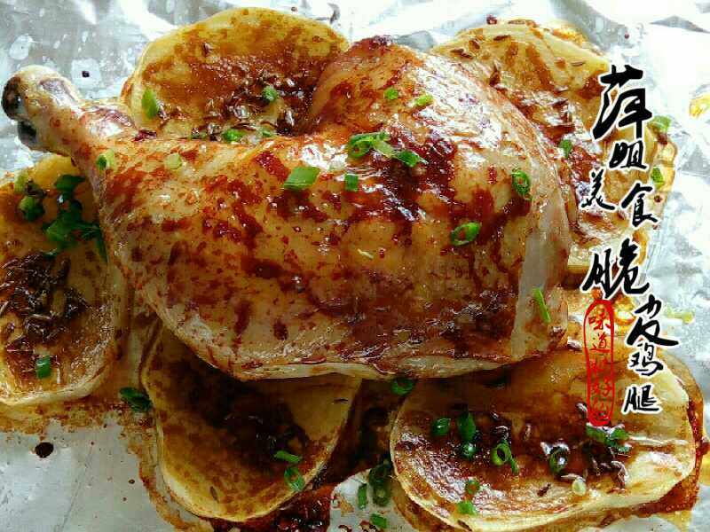 4:腌渍好的鸡腿放土豆片上面。