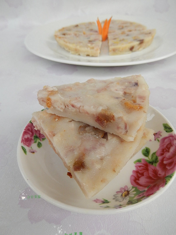 9:蒸好的芋头糕倒掉面上的水分,筷子插进去试一下,里面感觉很绵,这样就熟了。