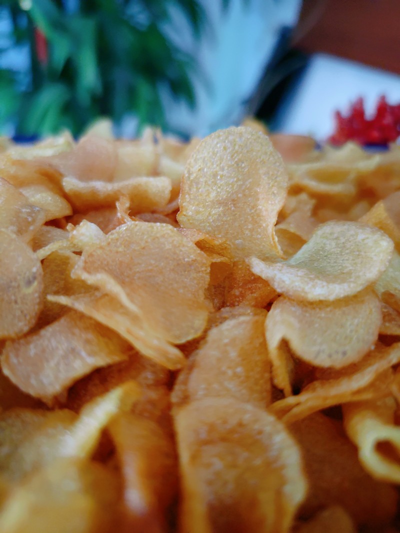 8:炸熟控油撒点盐拌匀,原味薯片完工