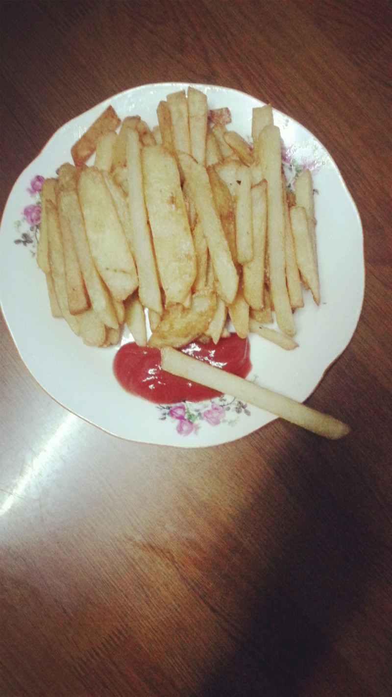 3:纯天然薯条,晾凉,撒少许盐,摇匀,配上上等纯纯的番茄酱,再次避免广告之嫌,加小番茄微80051927,推荐一款不贵又纯香的番茄沙司