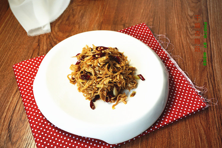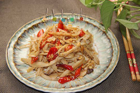 2:鲍菇撕成条状,干红辣椒洗净切斜段,生姜切丝