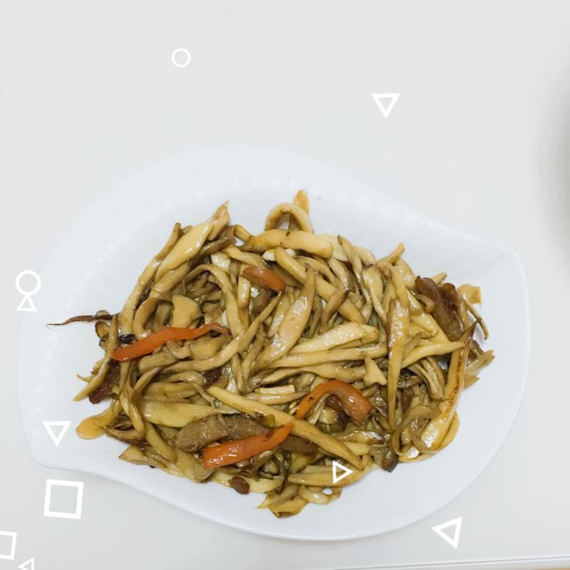 2:炒锅倒适量油,放入杏鲍菇丝翻炒!直至杏鲍菇水份都炒出,加盐,黑胡椒,蚝油翻炒均匀出锅!装盘前可根据个人口味,加入烧烤料!