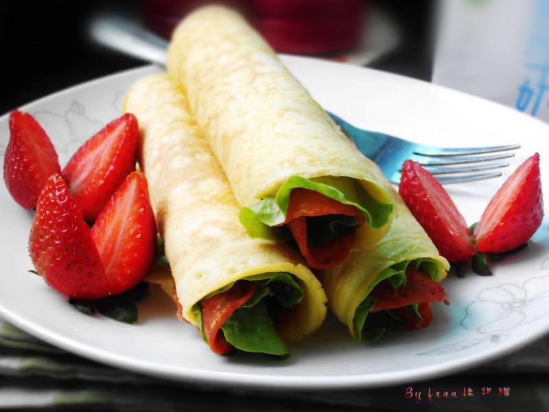 10:蛋皮上摆上一片生菜叶和几片香肠,再挤上适量沙拉酱;