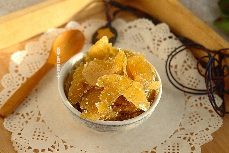 1:柚子皮去白瓤、切成丝放淡盐水泡1个小时、然后清水再泡一个小时!(中间要不停的换水以去除苦味、嫌苦可增加浸泡的时间)