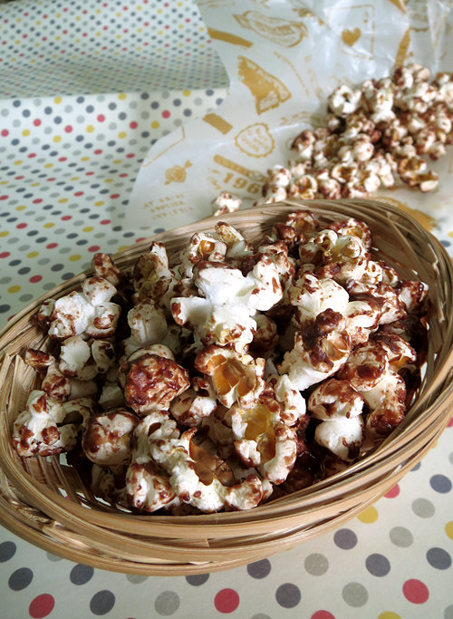 9:拌好了巧克力的爆米花晾一晾,热气没了就脆了,拌匀后倒在烤盘纸上晾凉即可。
