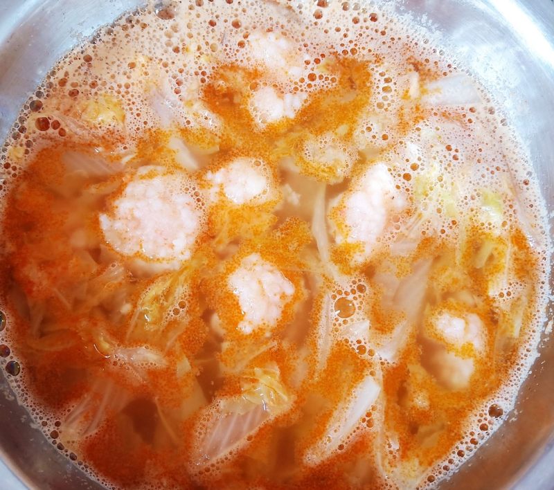 10:用小勺将准备好的虾滑整理成小圆丸子形,滑入锅内,同样的方法做好所有的虾仁丸子。