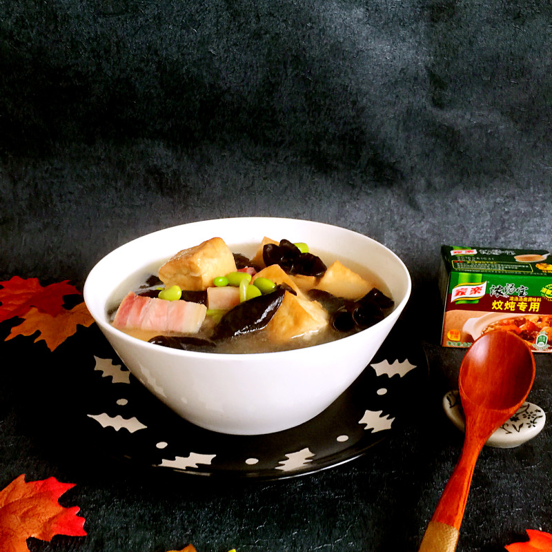 老豆腐250克;毛豆籽50克;咸肉50克;黑木耳少许;