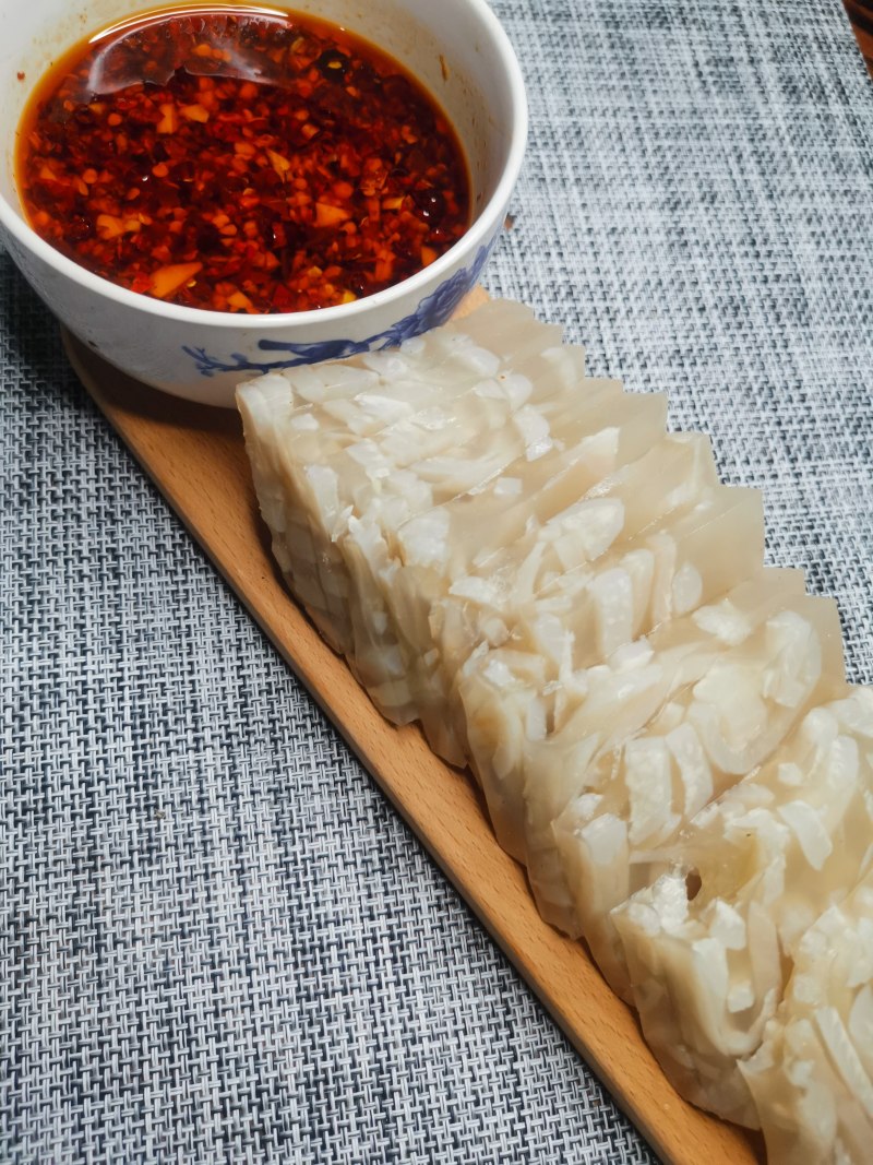 7:第二天要吃时,将皮冻切块,再搞一个蘸碟。一顿没吃完的,要继续冰箱冷藏,不然温度高会融化。