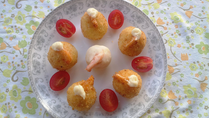 8:土豆山药泥将虾仁包住,露出尾巴部位在外,一个个捏成球形。