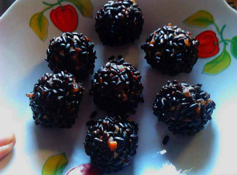 3:做成肉圆放入糯米中滚一圈,我做的小,一口一个。