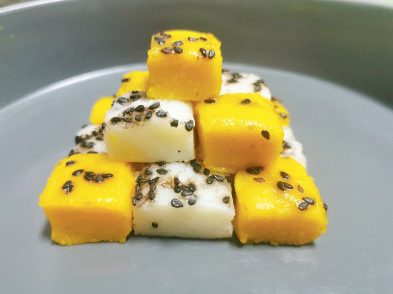 7:将做好的南瓜泥和山药泥造型叠加放在一起。