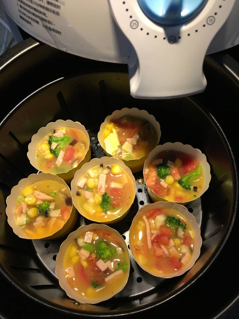 2:各种蔬菜跟鸡蛋混合,内脂豆腐垫底,倒入蛋糕杯
