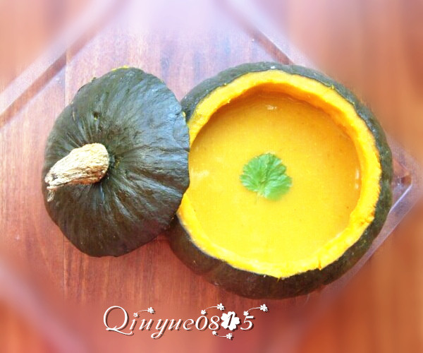 11:把南瓜蔬菜浓汤倒入南瓜盏中食用。