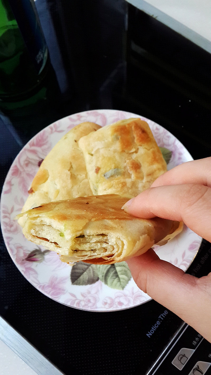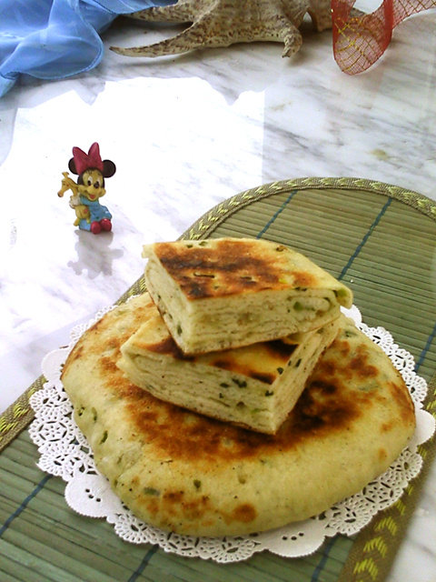 饼的大小可以随自己喜好任意调整。葱的用量随自己口味酌情增减。煎烙时需用小火,以免外焦内生。盖上盖子可以减少水分流失,以免成品口感偏干。