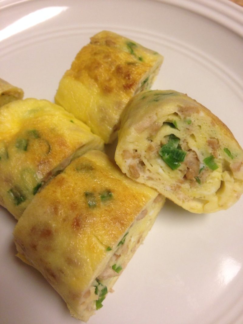 9:待表面的少许未凝固时,将第一个蛋卷卷回去;依此操作,直到把剩下的香葱蛋液全部摊入锅中,也全部卷成卷;此时的厚蛋烧已成雏形;但内部还有一些蛋液未完全凝固,小火,将蛋卷不时在锅中滚动加热,使其内部受热均匀,蛋液完全凝固。