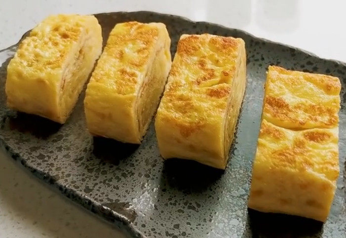 10:将完全成熟的蛋卷移到案板上,用利刀切成大小均匀的块,这就是传说中的“厚蛋烧”。