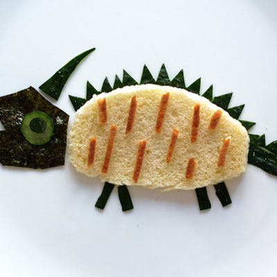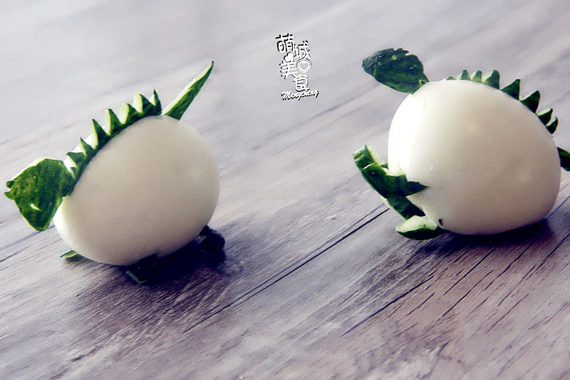 4:海苔剪出恐龙的头部。并用黄瓜片装饰恐龙眼睛。