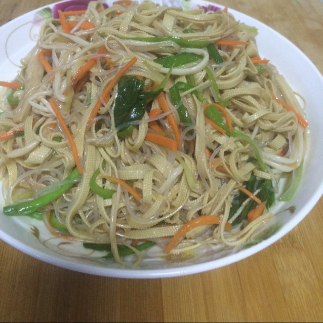 2:胡萝卜切丝,揉盐,3分挤水。豆皮,粉丝,金针菇,韭菜焯水后切丝切段