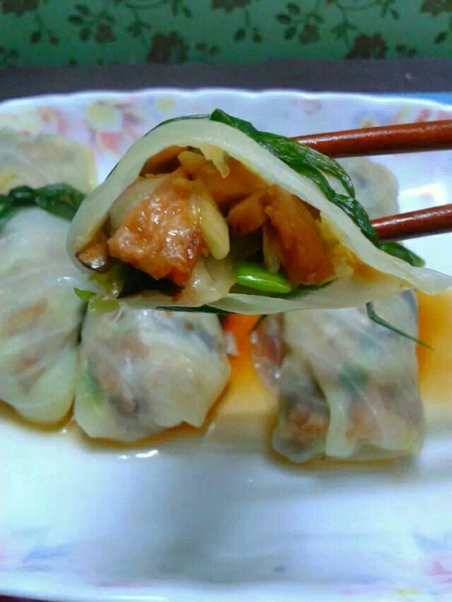 16:拿一个盘子,铺上春卷皮,再夹几筷子炒好的素菜铺在春卷皮上。