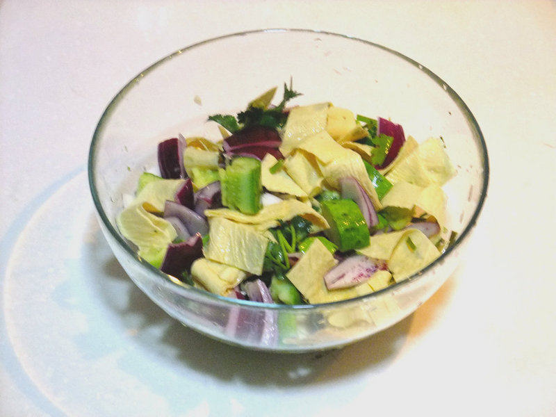 9:捞出放在一个大碗里,同时放入黄瓜。