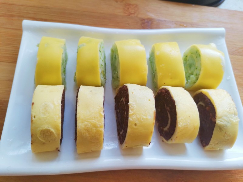 8:把蛋皮上均匀抹上山药泥,再从一端卷起,去头尾,切成自己喜欢的宽度。