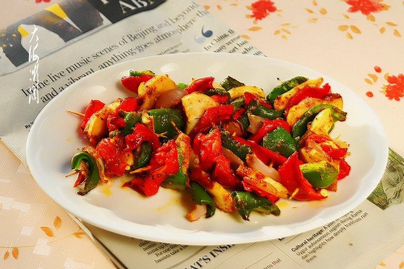 7:喜欢的可以在上面撒一些调料,似油炸兼烧烤味道的蔬菜串出炉。