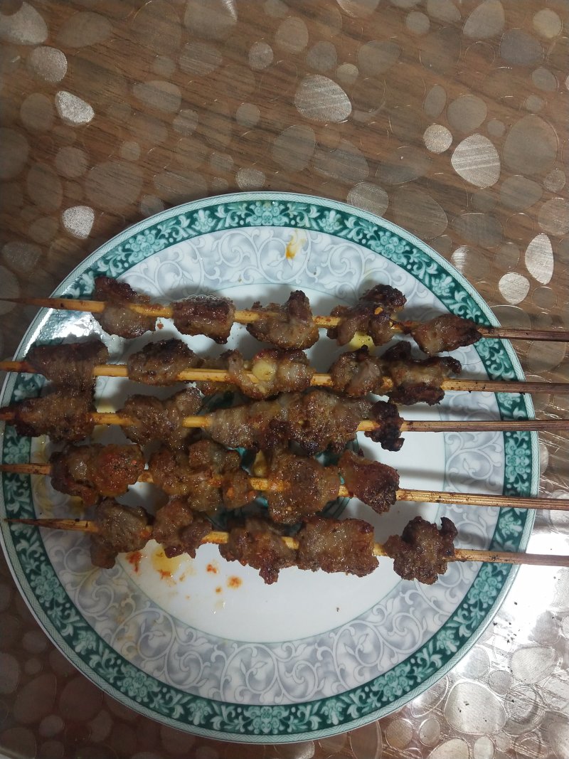 2:前一天烤的羊肉串留下了几串准备做炒饭先将羊肉撸下来。